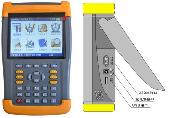 多功能手持式全自動(dòng)變比測試儀頂端部分是變比測試航空插頭,高壓側(cè),低壓側(cè)端子。多功能手持式全自動(dòng)變比測試儀的正面上部是彩色液晶屏,多功能手持式全自動(dòng)變比測試儀的下部是標(biāo)準(zhǔn)30鍵的控制鍵盤;在多功能手持式全自動(dòng)變比測試儀的右側(cè)打開支架可看到USB接口、充電接口、RS232接口。